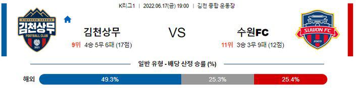 양 팀 모두 A매치 휴식기 전 득, 실점이 많았던 팀으로 김천은 직전 5경기 중 3경기에서 오버(2.5 기준)가, 수원은 직전 6경기 중 5경기에서 오버(2.5 기준)가 나온 점을 고려하면 오버(2.5 기준)의 확률이 높겠다. 또한 양 팀 모두 최근 흐름이 좋지 않지만, 김천은 중원과 공격 쪽에 국가대표팀에서 활약을 하고 돌아오는 선수들이 있기 때문에 해당 전력들의 자신감에 차 있는 상태. 국내에서 치른 평가전이기 때문에 체력적인 부담도 그리 크지 않을 것으로 보인다. 반면 그에 반해 별 다른 반전의 카드가 없는 수원이기 때문에 김천의 승리가 예상된다. 김천이 그래도 홈에서는 승리가 더 많다는 사실도 참고하면 좋다.