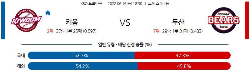 전일 경기 4-3 승리를 기록한 두산 이지만 3회 이후 추가 득점을 만들지 못하고 경기 후반에 3실점을 허용하면서 불펜의 소모가 많았다는 것이 금일 경기에서 좋지 않은 영향을 줄것이다. 또한, 6월 2경기 연속 조기강판을 당한 최원태 투수가 원정이 아닌 홈에서는 자신의 몫을 해낼 것으로 기대되는 경기. 키움 승리 가능성을 추천 한다.