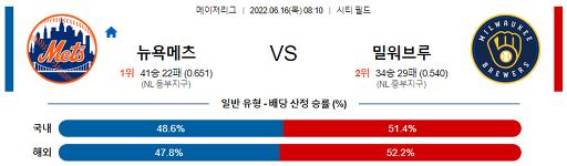 6월 16일 08:10 MLB 뉴욕 메츠 : 밀워키
