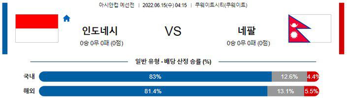 후에 언급하겠지만, 네팔이 직전 경기에서 다소 공격적인 모습을 보여줬기 때문에 이번 일정에서도 다득점 페이스가 예상된다. 오버(2.5 기준)의 가능성이 높겠다. 여기에 인도네시아는 신태용 감독이 팀을 맡은 이후 나름대로 경쟁력을 끌어올리며 본 대회 1차전에서 쿠웨이트를 잡아내는 저력을 발휘했다. 반면 네팔은 아직까지 남아시아에서도 최약체 타이틀을 벗어나지 못하는 중. 인도네시아의 승리가 예상된다.
