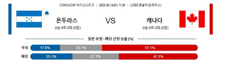 캐나다가 최근 원정에서 썩 좋지 못한 모습을 보이고 있으며, 직전 원정 맞대결에서도 점유율과 슈팅 숫자 면에서 열세였다는 점을 감안하면 핸디캡 무(H+1.0)의 가능성도 충분하다. 다만, 후에 언급하겠으나, 온두라스는 최근 19경기에서 단 1승밖에 거두지 못하며 급격하게 추락하고 있는 중이다. 반면, 캐나다는 황금 세대를 필두로 어려운 북중미 예선에서 당당히 조 1위를 차지해 36년만에 월드컵 본선에 진출했다. 기세 자체가 다른 상황. 캐나다의 일반 승은 따 놓은 당상이라고 해도 과언이 아니다.