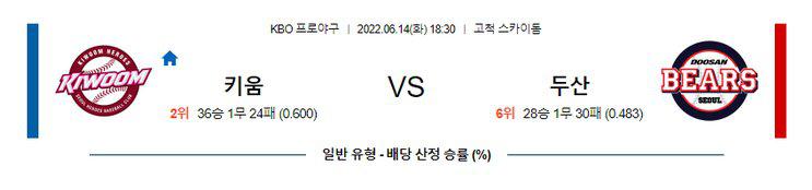 올시즌 키움을 상대로 좋은 기억을 만들어낸 박신지 투수 이지만 6월 변화구 제구에 아쉬움이 나타나고 있다. 선발 싸움에서 요키시 투수가 우위에 있는 경기다. 키움 승리 가능성을 추천 한다.