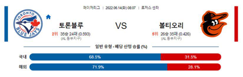 토론토의 승리를 본다. 볼티모어가 선발의 확실한 우위가 있어도 승리하기 어려운 토론토 상대로 원정에서 사이영을 노리는 상대 에이스를 만나야 한다. 최고의 피칭을 하고 있는 마노아가 볼티모어 타선을 막아낼 것이고 비셋과 스프링어가 브래디쉬를 두들길 토론토가 승리할 것이다.