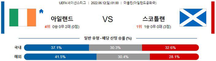 양 팀 모두 3백을 바탕으로 수비력이 좋으며, 전방 자원들이 부진하고 있다는 공통점을 갖고 있기 때문에 언더(2.5 기준)의 가능성이 매우 높겠다. 또한 후술하겠지만, 스코틀랜드는 나름 준수한 수비에 비해 공격진의 파괴력이 매우 떨어진다. 아일랜드의 3백을 상대로 변수를 만들 가능성은 매우 낮은 상태. 여기에 원정 경기임을 감안하면 아일랜드가 부진하고 있다고 해도 온전한 승점 3점을 가져가기에 어려운 구조. 승부의 추는 한 쪽으로 기울어지지 않을 것으로 보인다. 무승부 / 언더(2.5 기준)를 추천한다.