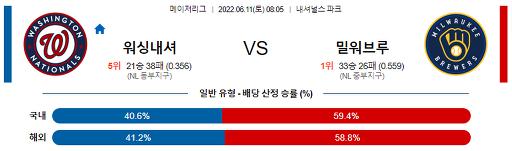 6월 11일 08:05 MLB 워싱턴 : 밀워키