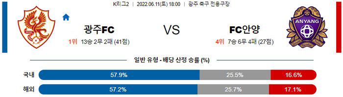 안양이 최근 실점 최소화를 위한 노력을 하고 있으며 광주도 이번 시즌 홈에서 3골 이상 터뜨린 경기는 직전 1경기 뿐이기에 언더(2.5 기준)의 가능성도 높겠다. 또한 후술하겠지만, 광주는 홈 9연승의 신기록을 쓰면서 상승세를 타고 있다. 리그에서 가장 뛰어난 공, 수 밸런스가 강점. 반면 안양은 득점력 부재를 겪으며 좀처럼 선두권으로 치고 올라오지 못하고 있는 상황. 특히, 상위 레벨 팀들과의 경기에서 승리가 없다. 때문에 이번 일정도 홈 팀 광주의 승리가 예상된다.