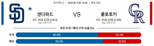 6월 11일 10:40 MLB 샌디에이고 : 콜로라도