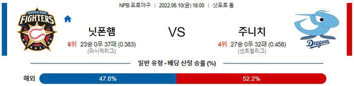 전일 경기 패배로 홈에서 펼쳐진 요코하마와 시리즈에서 루징 시리즈를 기록한 니혼햄과 지바롯데 원정에서 3연패를 당한 주니치의 만남 이다. 선발 투수의 팽팽한 투수전이 예상되는 가운데 최근 2경기에서 123개와 132개 투구수를 기록한 오노 유다이 투수 보다는 최근 홈에서 만큼은 페이스를 끌어올리며 12승6패 2.81을 기록한 2021시즌의 모습을 보여주기 시작한 우와사와 나오유키 투수에 대한 기대치가 높은 선발 매치업 이다. 니혼햄 승리 가능성을 추천 한다.