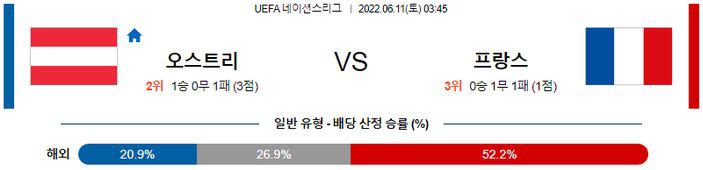 프랑스의 공격력은 유럽 최고 수준이라는 점과 오스트리아도 직전 2경기에서 모두 오버(2.5 기준)를 기록한 점을 고려하면 오버(2.5 기준)의 가능성이 높겠다. 또한 후술하겠지만, 프랑스는 아직까지 유럽 네이션스리그 승리가 없는 상황. 이번 일정에서 승리를 위해 100%의 전력을 쏟아 부을 것으로 보인다. 여기에 오스트리아가 랑닉 감독의 기조처럼 강한 압박을 시도할 것으로 예상되지만, 프랑스에는 중원에서 압박을 풀어낼 선수들과, 전방으로의 한번의 침투 패스를 통해 상대를 위협할 카드가 존재하기 때문에 이번 일정은 프랑스의 승리가 예상된다.