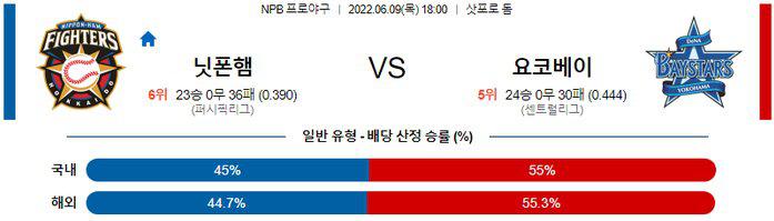 코로나 확진 이후 2군에서 컨디션을 조율하고 복귀후 2경기 1승1패를 기록중인 하마구치 하루히로 투수가 직전경기에서 교류전 7연승이 중단 되는 패배가 나왔지만 구위 자체는 좋았다고 생각된다. 또한, 니혼햄(7안타)이 전일 경기 5-3 승리로 5연패에서 벗어났지만 11안타를 기록한 요코하마 타선에게 경기 운(?)이 지독하게 따르지 않았다는 것도 참고 사항. 요코하마 승리 가능성을 추천 한다.