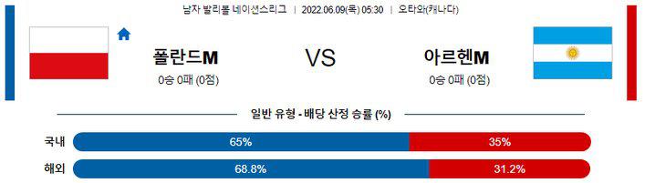 폴란드가 과연 베스트로 나오느냐가 관건. 일부 선수들이 명단에는 포함되어 있으나 안 나올 확률이 있고, 아르헨티나 역시 마찬가지다. 하지만 주전들이 다 나온다 가정하면 유리한 쪽은 역시 폴란드다. 세계적인 윙 스파이커들이 수두룩한 상황이기에 언제건 아르헨티나의 코트를 폭격을 할 수 있는 팀이다. 다른 것보다 센터라인의 우세가 폴란드에 있어 이 점이 가장 커 보인다. 전반적인 전력에서 폴란드가 우세해 폴란드의 승리를 예상하며, -1.5세트 핸디캡 승리까지 같이 봐도 좋다. 언오버 기준점이 184.5점으로 높은데, 풀 전력 가정 시 184.5점의 언오버 기준점을 넘기지 않을 확률이 높다. 언더부터 봐야 한다.