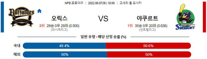 교류전 12경기중 8경기에서 멀티히트를 기록중이 스기모토를 중심으로 철전한 팀 타격으로 5연승을 만들어 낸 오릭스 이다. 4연승을 만들어 낸 야쿠르트의 리듬이 나쁘다고 볼수 없지만 1.29 평균자책점을 기록중인 야마오카 타이스케 투수를 상대로 활발한 공격력을 보여주기는 힘들 것이다. 오릭스 승리 가능성을 추천 한다.