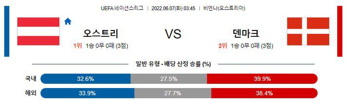 양 팀 모두 2022년 들어 치른 3번의 A매치 모두 오버(2.5 기준)가 나왔기 때문에 오버(2.5 기준)의 가능성이 높겠다. 또한 랑닉 감독이 새로 부임한 오스트리아도 직전 경기에서 뛰어난 모습을 보여줬지만, 상대인 크로아티아가 로테이션을 돌린 탓도 있었으며 선수 개개인이 만들어낸 득점이 대부분이었다. 팀 압박과 전술이 100%가 아니라는 증거. 어느덧 3년차인 훌만드 감독이 이끄는 덴마크의 승리가 예상된다.