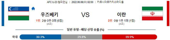 이란이 다소 수비적으로 내려서서 경기를 펼칠 것으로 보이며, 우즈베키스탄이 이미 토너먼트 진출이 확정된 상황이기 때문에 힘을 뺀 채 경기에 나설 가능성이 높다. 때문에 저득점 페이스가 유력하며 언더(2.5 기준)의 가능성이 높겠다. 또한 후술하겠지만, 이란은 본 대회에서 21세 이하로 출전해 1승도 거두지 못하고 있는 상황. 반면 우즈베키스탄은 2경기 7골 0실점으로 매우 강력한 모습을 보이고 있다. 개최국 이점도 지니고 있기 때문에 이번 일정은 우즈베키스탄의 승리가 예상된다.