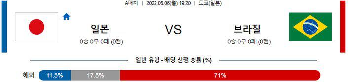 브라질이 최근 4번의 A매치 모두 4골 이상 넣는 저력을 발휘하고 있기 때문에 오버(2.5 기준)의 가능성이 높겠다. 또한 후술하겠지만, 브라질은 직전 한국과의 경기에서도 매우 강력한 모습으로 다득점 승리를 기록했다. 일본도 최근 한국과 더불어 아래에서부터의 빌드업 축구를 중요시 하기 때문에 브라질의 강력한 압박에 막혀 어려움을 겪을 것으로 보인다. 브라질의 압승을 예상한다.