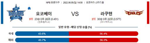 요코하마는 어제, 선발 교야마가 5이닝, 4개의 피안타, 1실점으로 마운드를 내려왔고, 이어던진 3명의 불펜(크리스키, 승리)이 무실점으로 방어했으며, 마키의 3점 홈런포가 터진 타선이 12안타 6득점으로 분전하며 경기를 승리로 이끌었다. 오늘 선발 이시다는 4월 6일, 한신 타선을 상대로 6이닝, 4개의 피안타, 1실점으로 마운드를 내려왔다. 이후 컨디션 난조를 보여 2군으로 내려가 3경기, ERA 2.63의 성적을 보였고, 오늘 선발 마운드에 나선다. 그다지 좋아 보이지 않지만, 부진의 라쿠텐 타선이 최근 경기를 만들지 못하고 있는 상황에 편승하여 알모레호스, 아사무라, 시마우치 등 라쿠텐 장거리포에게 경계 투구하며 에스코바, 야마사키 등 안정감의 불펜으로 공을 넘길 것으로 예상한다.라쿠텐은 4일, 선발 하야카와가 5.1이닝, 6개의 피안타, 1실점으로 호투했지만, 4명의 불펜이 흔들리며 5실점, 부진의 타선이 산발 7안타 1득점에 그쳐 경기를 내주고 말았다. 오늘 선발 노리모토는 5월 29일, 야쿠르트 타선을 상대로 8이닝, 5개의 피안타, 무실점으로 승리투수가 됐다. 코로나 감염에서 돌아와 5월, 5경기, 3승 1패, ERA 2.18로 호투하고 있으며, 오늘도 미야자키, 소토, 마키 등 요코하마 장거리포를 봉쇄하며 호투하겠지만, 부진 중인 타선의 영향으로 승운과는 거리가 멀어 보인다. 홈팀 요코하마의 승리를 예측한다.