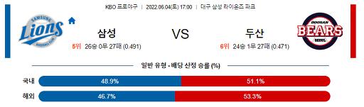 삼성의 승리를 본다. 곽빈 상대로는 팀 타선이 유독 잘 터졌는데 피렐라와 오재일, 이원석으로 이어지는 클린업트리오가 1차전에 이어 토요일 경기에서도 생산력을 낼 것이다. 두산은 페르난데스가 살아났지만 다른 선수들의 컨디션 저하가 있다.원정에서 고전이 예상된다. 삼성의 다득점 경기를 보기에 오버가 유력하다.