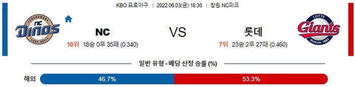 구창모 투수가 성공적인 데뷔전을 치렀지만 아직은 한계 투구수가 많지 않다. 올시즌 롯데의 새로운 에이스 등극을 신고한 반주 투수가 집중력 높은 투구내용을 보여줄 것으로 기대되는 경기다. 롯데 승리 가능성을 추천 한다.