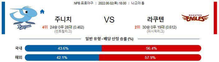 좌타자가 팀의 중심이 되고 있는 라쿠텐을 상대로 좌완 마츠바 타카히로 투수가 짠물투구를 펼쳐보일 것으로 예상되는 경기다. 주니치 승리 가능성을 추천 한다.