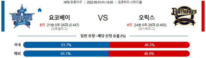 전일 경기에서는 요코하마가 4-1 승리를 기록하며 시리즈 기선제압에 성공했다. 2연패에서 벗어나는 승리가 나왔으며 교류전 4승3패, 시즌 21승26패 성적. 1회 1실점을 허용했지만 추가 실점을 허락하지 않았고 9안타를 기록하는 가운데 상하위 타선에서 고르게 타점이 만들어진 경기. 반면, 오릭스는 최근 4경기 1승3패 흐름 속에 교류전 2승5패, 시즌 24승29패 성적. 상대 수비실책으로 1득점을 기록했지만 8안타, 9개 잔루를 남기는 답답한 결정력이 나타난 경기.