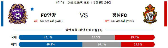 경남이 다득점 다실점의 기조로 최근 리그 5경기 중 3경기에서 오버(2.5기준)가 나온 점, 이번 시즌 첫 번째 맞대결에서도 오버(2.5 기준)가 나온 점을 고려하면 오버(2.5 기준)의 가능성이 높겠다. 후술하겠지만, 안양의 흐름이 매우 좋지 않은 상황이다. 특히, 홈에서도 3경기 연속 무승부를 기록 중. 반면 경남은 설기현 감독의 4-4-2가 팀에 녹아들며 리그 5경기째 패배가 없다. 특히, 홈보다 원정에서 강한 면모를 보여주고 있는 중. 이번 일정도 경남의 승리가 예상된다.