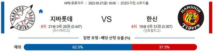 지바롯데는 목요일 원정에서 히로시마 상대로 6-3 승리를 기록하며 시리즈 2승1패를 기록했다. 시즌 21승26패 성적. 선발 카와무라 토키토 투수가 3이닝 2실점으로 흔들리자 4회 부터 불펜을 가동했고 레어드가 2안타(1홈런), 3타점으로 타선을 이끌었던 경기. 반면, 한신은 목요일 홈에서 라쿠텐 상대로 0-1 패배를 기록하며 시리즈 1승2패를 기록했다. 2연패 흐름 속에 시즌 18승31패 성적. 2연패 기간 동안 1득점 밖에 생산하지 못하고 있고 필승조 불펜의 진검 승부에서 밀린 경기.