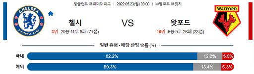 첼시가 하위 3개팀과의 5경기에서 모두 다득점 페이스가 나온 점, 왓포드가 이전 경기에서 5실점을 허용한 점을 고려하면 오버 ▲(3.5 기준)의 가능성이 높겠다. 또한 후술하겠지만, 첼시는 시즌 막바지에 경기장 안팎으로 문제를 겪으며 성적을 내지 못했으나, 하위 3개팀만은 확실하게 잡아냈다. 하위 3개팀과의 5번의 경기에서 전승을 기록 중. 반면 왓포드는 리그 8경기에서 1무 7패를 기록 중이다. 최악의 페이스. 여기에 부상자까지 많은 상황이기 때문에 첼시의 압도적인 승리를 예상한다.