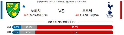 언급하겠지만, 노리치는 조기 강등이 확정된 팀으로 동기부여 차원에서 매우 떨어지는 모습을 보이고 있다.반면 토트넘은 챔피언스리그 진출에 대한 가능성이 굉장히 올라온 상황. 동기부여가 매우 충만하다. 객관적인 전력과 상대 전적 모두 토트넘이 우위에 있으며, '핵심 2선' 손흥민을 비롯한 공격진의 컨디션도 매우 좋기 때문에 토트넘의 다득점 승리가 예상된다. 또한 노리치의 핸디캡 패(H+2.0)와 오버 ▲(3.5 기준)도 가능성이 있겠다.