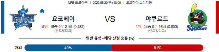 요코하마는 수요일 원정에서 주니치 상대로 7-6 승리를 기록하며 시리즈 2승을 기록했다. 2연승 흐름 속에 시즌 16승21패 성적. 3번 타자 소토가 3안타, 2타점, 2득점으로 해결사가 되었고 팀은 11안타(1홈런)를 기록한 경기. 또한, 필승조 불펜 싸움에서 승리를 가져갔다는 것도 고무적 이였다. 반면, 야쿠르트는 목요일 홈에서 한신 상대로 3-0 승리를 기록하며 시리즈 2승1패를 기록했다. 최근 5경기 4승1패 흐름 속에 시즌 16승27패 성적. 5월3일 한신과 경기에서 완봉승을 기록한 이후 5월 2경기(1승1패)에서 16이닝 1실점의 짠물투구를 펼치고 있던 오가와 야스히로 투수가 7이닝 무실점 승리를 기록했고 7안타, 3득점을 생산한 경기.