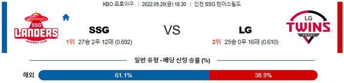 SSG는 목요일 원정에서 두산 상대로 9-3 승리를 기록하며 시리즈 2승1무를 기록했다. 2연승 흐름 속에 시즌 27승12패 성적. 폰트 투수가 7이닝 3실점 승리투로 지쳐있던 불펜의 부담을 덜어줬고 12안타(1홈럼)를 기록한 경기. 반면, LG는 목요일 원정에서 KT 상대로 7-3 승리를 기록하며 시리즈 2승1패를 기록했다. 2연승+ 최근 5경기 4승패 흐름 속에 시즌 25승16패 성적. 채은성이 해결사 본능을 발휘하며 3안타, 4타점으로 맹활약 하는 가운데 팀은 15안타를 폭발시켰고 임찬규 투수의 5이닝 무실점 승리투가 나온 경기.