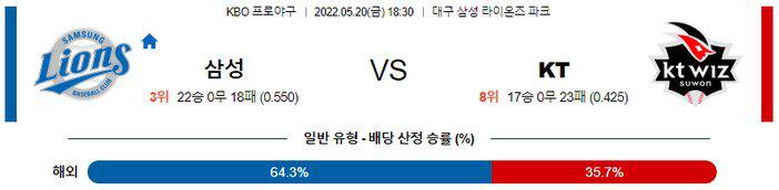 삼성은 목요일 원정에서 한화 상대로 10회 연장전 승부 끝에 2-1 승리를 기록하며 시리즈 2승1패를 기록했다. 2연승 + 최근 7경기 6승1패 흐름 속에 시즌 22승18패 성적. 원태인 투수의 8이닝 1실점 역투가 나왔고 실점을 막아내는 호수비의 연속이 나왔으며 4월과는 차별화 되는 5월의 강력한 뒷심을 보여준 경기. 반면, KT는 목요일 홈에서 LG 상대로 3-7 패배를 기록하며 시리즈 1승2패를 기록했다. 2연패 흐름 속에 시즌 17승23패 성적. 선발 고영표 투수가 5.1이닝 5실점으로 무너졌고 8안타, 14개 잔루를 남긴 경기.