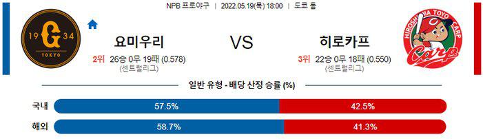 4월29일 투구중 몸에 이상을 느끼고 마운드를 내려온 이후 재활과 점검의 시간을 통해서 컨디션을 많이 회복 된 모습을 보여준 스가노 토모유키 투수 이지만 지난시즌 부터 부쩍 잦아진 부상으로 리그를 지배하던 강력한 에이스의 모습은 사라져가고 있다고 생각된다. 또한, 팀의 간판타자 오가모토가 5월 1할대 타율의 침묵에 빠져 있다는 것과 전일 경기 승리의 과정에서 불펜의 소모가 많았던 요미우리 였다. 히로시마 승리 가능성을 추천 한다.