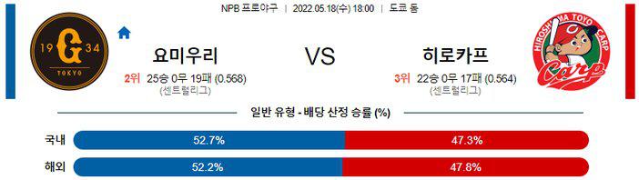 2연속 선발승을 기록중이며 올시즌 요미우리 상대로 3경기 등판에서 모두 7이닝 이상 3실점 이하 투구 내용을 보여준 토코다 히로키 투수가 선발 싸움에서 우위에 있다. 또한, 히로시마가 공격적인 불펜의 운영을 통해서 화요일 경기에서와 같은 실수를 하지 않을 것이다. 히로시마 승리 가능성을 추천 한다.