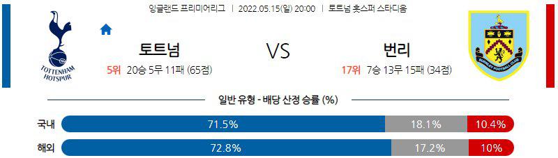 언더(2.5)를 주력으로 삼는 것이 좋다. 토트넘이 라인을 내리는 상대에게는 어려움을 겪고있다. 그나마 지난 경기를 수월하게 치르면서 손흥민과 쿨루셉스키의 체력적 안배를 꾀하기는 했지만, 라인을 내릴 번리를 상대로는 공간 확보에서는 고전할 가능성이 높다. 다만 번리의 중앙 수비 라인에 공백이 심하며, 공격적으로도 단순한 방식만을 채택할 수 밖에 없어 번리의 승리를 예측하기에는 어렵다.