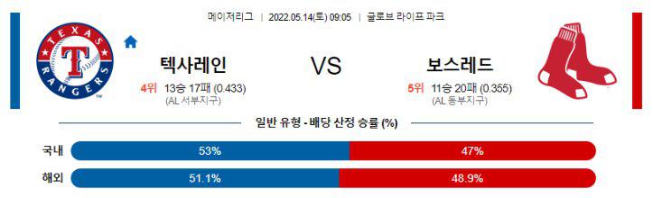 텍사스의 승리를 본다. 피베타가 이전 경기에 호투하긴 했지만 한 경기 호투로 살아났다고 보긴 어렵다. 또, 보스턴은 데버스와 보가츠, 마르티네즈를 제외한 키케와 버듀고, 스토리와 브래들리등이 모두 부진하다. 선발에서 앞설 수 있고 시거와 솔락, 로우등이 피베타를 공략할 텍사스가 시리즈 첫 경기를 승리할 것이다.