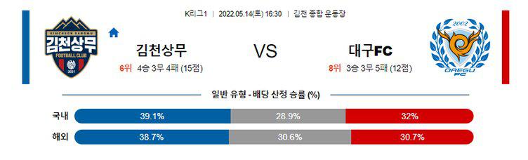 양 팀이 직전 경기에서 장, 단점을 선보이며 오버(2.5 기준)를 기록한 점, 양 팀의 최근 3차례 맞대결에서 2번의 오버(2.5 기준)가 나온 점을 고려하면 오버(2.5 기준)의 가능성이 높겠다. 또한 후술하겠지만, 대구는 아시아챔피언스리그에서의 기세를 이어 리그에서도 1승 1무를 기록하고 있다. 특히, 세징야가 돌아오면서 대구는 지난 시즌 3위를 기록했던 모습을 다시 보여주고 있다. 반면 김천은 최근 공격 작업에 애를 먹으며 패배가 잦아지고 있다. 정태욱의 복귀 이후 대구의 수비도 좋아지고 있기 때문에 대구의 승리가 예상된다.