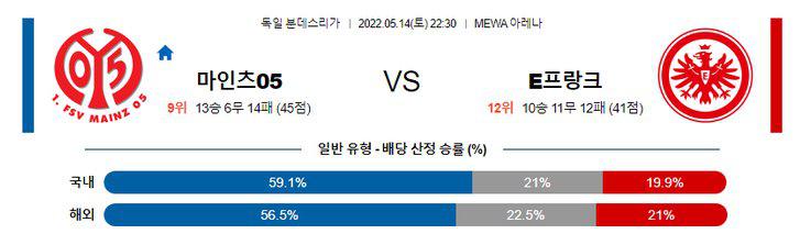 마인츠가 승리할 것이다. 홈에서 극강의 모습을 보여주고 있는 마인츠를 상대로 프랑크푸르트가 전력 보존에 더 힘 쓸 것이다. 프랑크푸르트의 현재 관심사는 유로파리그 결승. 지난 경기에서도 공격의 에이스인 코스티치를 선발제외하는 모습을 보이기도 했다. 마인츠가 보여주고 있는 극강의 홈 성적을 고려하면, 무난하게 승리를 가져올 가능성이 높다. 마인츠의 홈 화력을 고려하면 오버(2.5)도 고려할 만 하다.