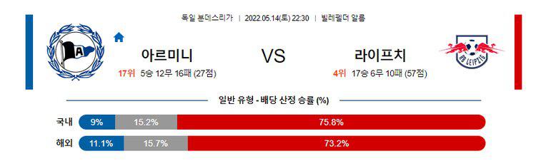 라이프치히가 승리할 것이다. 라이프치히가 훌륭한 화력과 효율성을 바탕으로 다득점 승리까지 노려볼 것이며, 빌레펠트는 리그 최악의 득점력을 가지고 있고, 강한 압박을 바탕으로 한 수비는 라인 붕괴 위험을 더욱 걱정해야 할 것이다. 핸디(+2.0)를 홈 팀에게 주어도 라이프치히가 승리할 가능성이 높다. 최근 빌레펠트가 세 경기 연속으로 득점을 기록하고 있다는 점을 고평가한다면 오버(3.5)를 점쳐볼 수 있는 매치다.