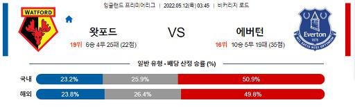 에버튼의 승리 가능성이 높다. 이미 강등이 확정된 왓포드가 크게 동기를 가질 만한 요소가 없다. 에버튼이 다득점은 아니더라도 공격적으로 어느정도 성과를 내고 있고,. 왓포드의 빈약한 수비력으로는 이를 무실점으로 막아내기 어렵다. 다만 에버튼이 최근 수비적으로는 안정감을 우선시하는 운영을 보여주고 있어, 다득점을 무리하게 노리지는 않을 것으로 보인다.