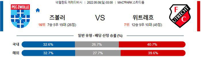 다득점을 기대해볼 수 있는 상황. 리그에서 두 번째로 득점이 적지만, 위트레흐트를 상대로는 최근 5경기 동안 모두 득점을 기록한 바 있다. 3골을 넣은 경기도 세 번이나 있을 정도. 이는 위트레흐트가 언제나 라인을 올리고 공격적인 태세를 취하기 때문. 넓어진 뒷공간을 즈볼레가 롱볼로 공략하는 경기 양상이 많이 나오고 있다. 다팔로우(FW / 최근 3경기 1도움)의 공중볼도 강점이 될 수 있지만 레덴(FW / 최근 3경기 1골)의 뒷공간 공략도 상정해볼 수 있다. 득점력과는 별개로 최근 맞대결 전적을 고려해야 하는 경기다.