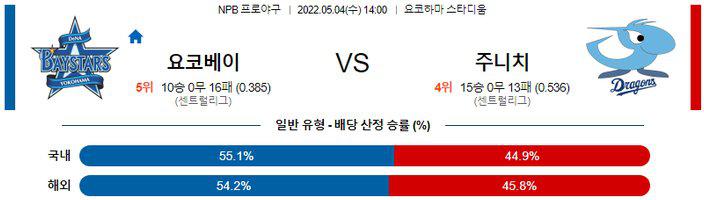 전일 경기에서는 주니치가 7-3 승리를 기록하며 시리즈 기선제압에 성공했다. 3연승 흐름 속에 시즌 15승13패 성적. 오가사와라 신노스케 투수가 타선의 도움 속에 5.2이닝 3실점 승리투를 기록했고 11안타 경기를 하는 가운데 중심 타선의 집중력이 살아난 모습. 반면, 요코하마는 4연패 흐름 속에 시즌 10승16패 성적. 4연패 기간 동안에 투타의 엇박자 현상이 이어지고 있고 수비 실책이 실점으로 연결되는 모습이 화요일 경기에서 나왔다.