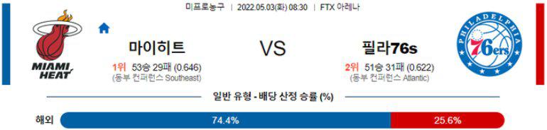 PO 1라운드에서 애틀란타를 4-1로 제압한 마이애미와 토론토를 4-2로 꺽고 올라온 필라델피아의 PO 2라운드 1차전 이다. 필라델피아는 엄지손가락 인대 파열로 부상 투혼을 펼치고 있던 조엘 엠비드가 토론토와 6차전 직후 안면 골절까지 생기면서 부상자 명단에 이름을 올리는 대형악재가 발생했다. 상대의 장단점을 정확하게 파악하고 맞춤형 수비 전술과 선수 매치업을 가져가고 있는 마이애미가 홈에서 주도권을 가져갈 것이다. 마이애미 승리 가능성을 추천 한다.
