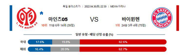 전력 상 바이언의 승리를 점치는 것이 안전하지만, 고전할 가능성이 있다. 선제골이 늦어질수록 경기가 잘 안풀리는 성향이 짙어졌기 때문. 마인츠의 홈 수비력을 고려하면 선제골이 늦게 나올 가능성도 충분한 상황. 우승을 확정 지은 터라 동기부여 문제도 염두에 둬야하는 상황이다. 홈패 쪽으로 접근하는 것이 가장 안전한 픽이다.