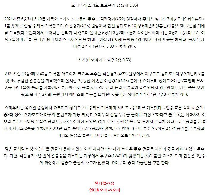 ▶ 신시내티(3승 15패 / 마흘 : 1승 2패, 6.88) 마흘은 올시즌 첫등판에서 5이닝 1실점(무자책)을 기록한 이후 부진한 모습을 보여주고 있다. 패스트볼의 구속도 2마일정도 하락했고 변화구의 제구도 잘되지않는 상황!! 따라서 오늘 경기 호투가 기대되지는 않는다. 그리고 오늘 불펜운용은 문제없을 전망이다. ▶ 샌디에이고(12승 7패 / 마르…