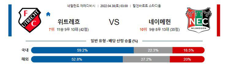 위트레흐트의 승리 가능성이 높다. 네이메헌이 상위권 팀의 공세를 버티지 못하는 경우가 잦다. 다양한 공격 루트를 가진 위트레흐트가 충분히 공략 가능한 상대다. 다만 위트레흐트의 약점인 뒷공간 공략으로 한골 정도의 실점은 충분히 가능한 시나리오. 오버(2.5)와 홈승을 예측할 수 있는 매치다.