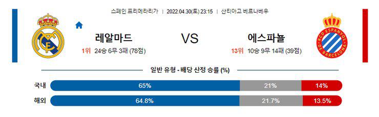 에스파뇰이 최근 6경기 중 5경기에서 언더(2.5 기준)가 나온 점, 레알마드리드가 챔피언스리그 4강 2차전을 앞두고 로테이션을 돌릴 가능성이 높은 점을 고려하면 언더(2.5 기준)를 고려해보는 것도 좋다. 여기에 후술하겠지만, 레알마드리드의 최근 리그 흐름은 좋은 편이다. 특히 바르셀로나전을 제외하면 이번 시즌 홈에서 패배가 단 1번도 없다. 반면, 에스파뇰은 이번 시즌 원정에서 단 1승밖에 거두지 못하고 있기 때문에 홈, 원정 차이가 극명한 만큼 레알마드리드의 승리가 예상된다. 레알마드리드 승 / 언더(2.5 기준)를 추천한다.