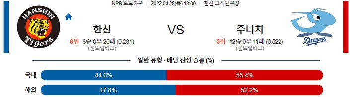 전일 경기에서는 한신이 3-1 승리를 기록하며 시리즈 기선제압에 성공했다. 2연승 흐름 속에 시즌 6승20패 성적. 니시 유키 투수가 6이닝 1실점 승리를 기록했고 3명의 필승조 불펜이 3이닝을 무실점으로 막아낸 경기. 반면, 주니치는 최근 4경기 1승3패 흐름 속에 시즌 12승11패 성적. 수비 실책이 빌미가 되면서 허용하지 않아도 되는 2실점을 헌납했고 상대 보다 1개가 더 많은 9안타를 기록했지만 9개 잔루를 남기는 답답한 결정력이 나타났다.
