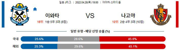 후술하겠지만, 최근 양측의 리그 흐름과 경기력이 매우 좋지 않다. 이와타는 이번 시즌 홈에서 아직까지 승리가 없으며 나고야는 원정에서 아직까지 승리가 없다. 양 팀의 홈, 원정 무승 기록은 이번 일정에서도 이어질 것으로 보인다. 또한 나고야가 3백을 사용하면서부터 더욱 저자세로 경기에 임하고 있기 때문에 저득점 페이스가 될 가능성이 높겠다. 최근 3경기에서 언더(2.5 기준)가 나온 점을 참고하면 좋다. 주어진 무 배당은 3.05배 수준으로 다소 아쉬운 고배당이지만 그럼에도 양 팀의 최근 수준을 고려하면 무승부 / 언더(2.5 기준)를 추천한다.