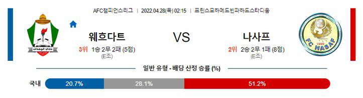 언더(2.5)가 주력이다 나사프가 안정성을 추구한다면 서로를 쉽게 공략하기 어렵다. 알웨흐다트 역시 공격력 기복이 심해 다득점 가능성은 낮다. 공격력이 서로 비슷하다고 본다면 수비력이 더욱 뛰어난 나사프의 승리에 손을 들어줄 수 있다.