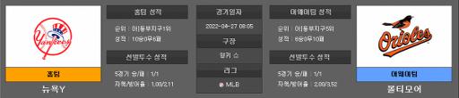 MLB분석 4월27일 MLB 뉴욕Y : 볼티모어
